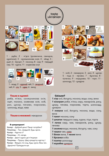 With this free worksheet you will learn food vocabulary and containers in Ukrainian. Keys included.